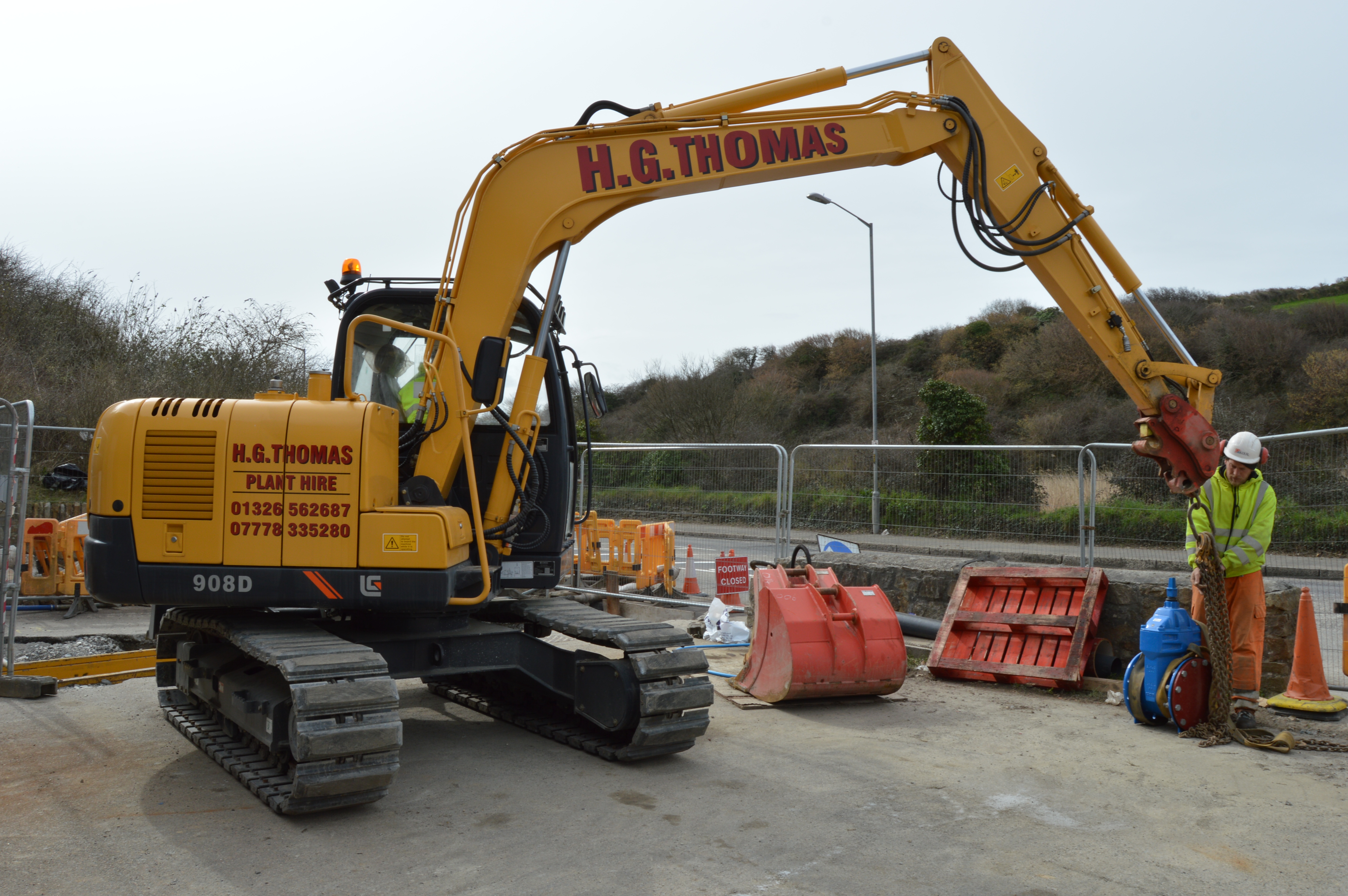 It was on the toughest section of the job that we caught up with H. Thomas Plant Hire’s latest addition to the fleet, an 8 tonne class LiuGong 908D, which is the first Chinese machine to be sold into the Cornish market. Talking about his decision to choose a LiuGong Harold said “I had been considering a change of brand for some time, I did a fair bit of research on them and after reading about the machines in Earthmovers Magazine, I decided to contact Construction Plant & Machinery Sales (CPMS) the UK dealers in Portsmouth, who I must say were incredibly helpful. I won’t deny one of the reasons the machine appealed was the price, but in addition looking at the spec I was very impressed with the machines common components, most of which can be found in more perceived up market brands. Also on spec the machine is capable of lifting more than our existing 8 tonne class excavators which surprised me”.