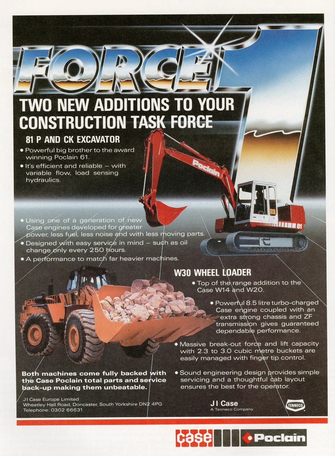 Finishing off with this advert for JI CASE in 1987, who by that time had taken over the French manufacturer Poclain, whose modern looking machines, with high pressure hydraulic systems had taken the industry by storm in the early 80’s. The machines unfortunately suffered terribly with hydraulic leaks, much like the British Hymac machines, whereas the Japanese had developed hydraulic systems that were more often than not, dry as a bone.
