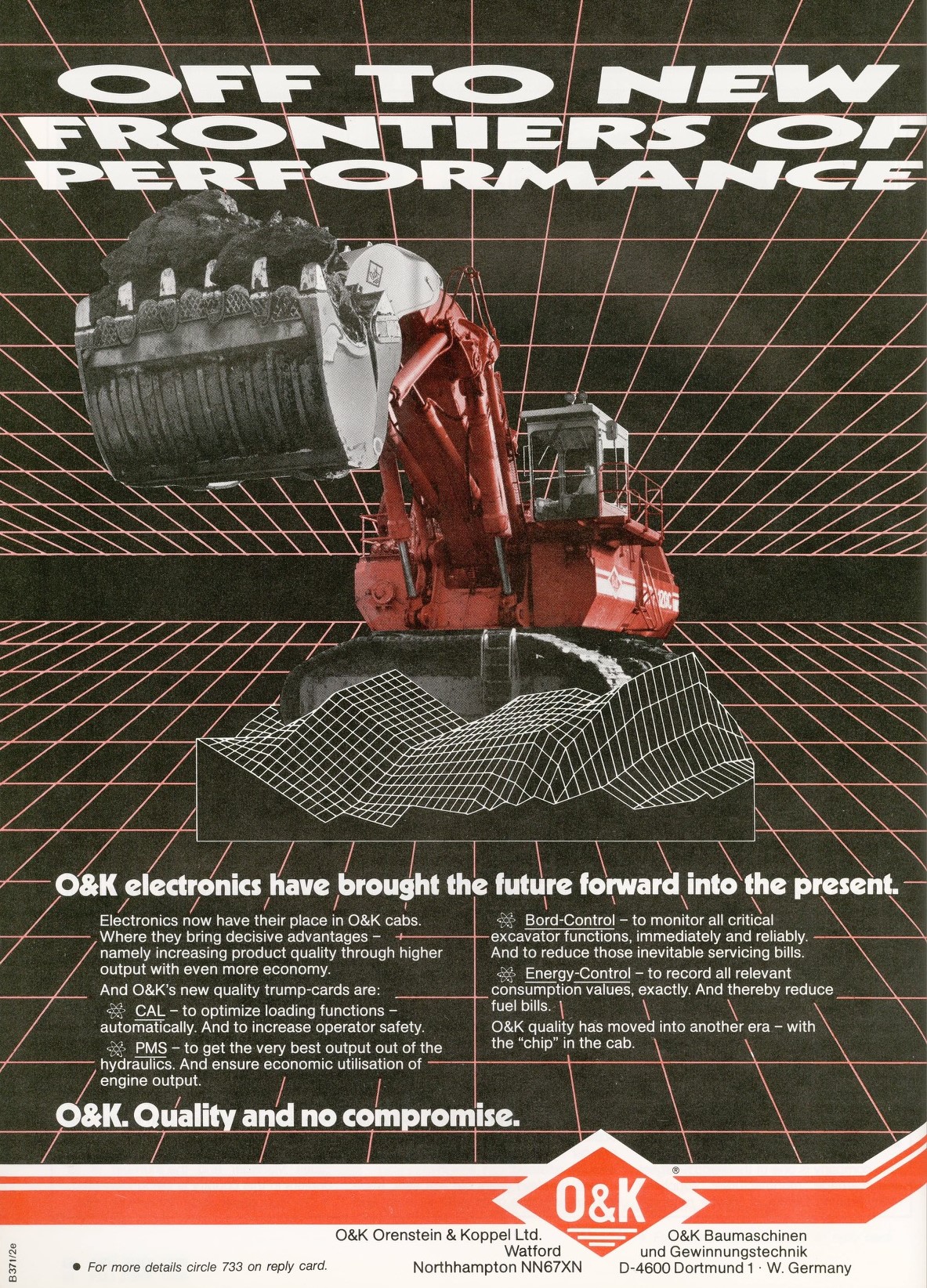 There is a bit of a theme developing in this post, as German brand O&K (Orenstein & Koppel) is another brand that has since disappeared from the market. In this advert that features an RH120C face shovel, they are promoting the companies’ new electronic systems that were featured in these big machines.