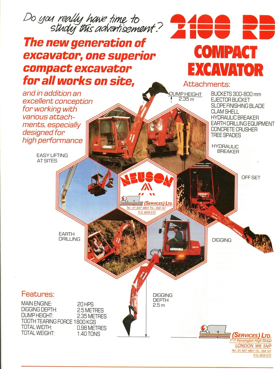 Austrian manufacturer Neuson introduced their first mini excavator in 1984, and various models were added to the range over the coming years, including the 1.5-tonne class 2100 RD seen in the advert above. The company was eventually merged with German business Wacker, to become what we know today as Wacker Neuson.