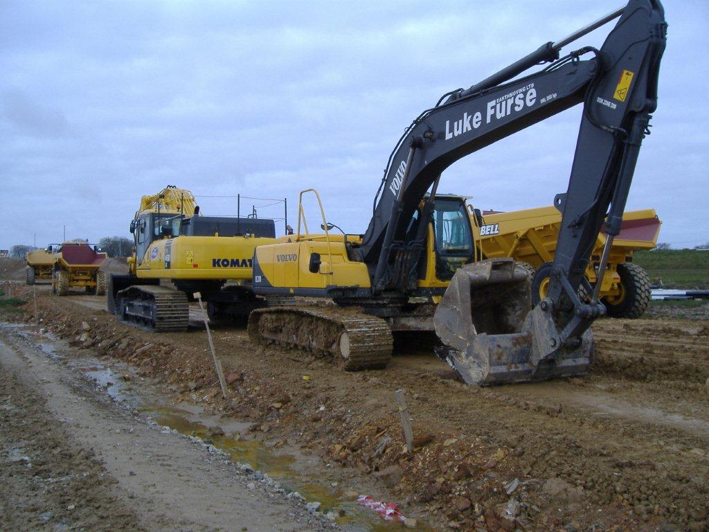The rock was transferred to the embankment area by a fleet of Caterpillar articulated dumptrucks and pushed out by a Komatsu D155 dozer.