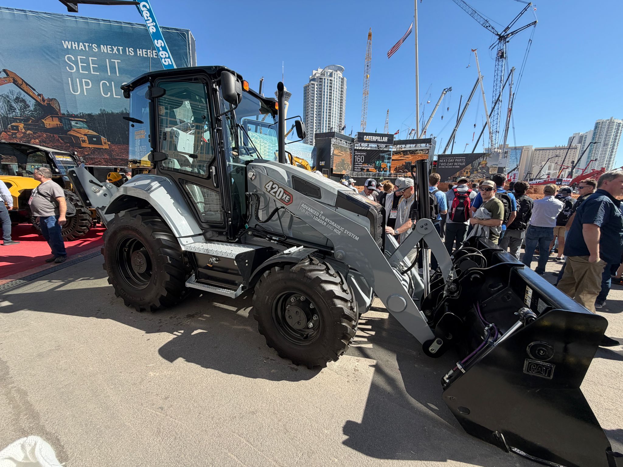 Most well-known for being a backhoe loader operator for 30 year’s Ken is always drawn to the venerable multi-purpose machines, and at Conexpo-Con/Agg there were plenty of them to see, being a Cat man at heart, we naturally start with a visit to the Caterpillar stand, where a star attraction was the Cat 420XE American centre mount backhoe loader, which features the new Advanced E/H (Electro/Hydraulic) hydraulic system for both the loader and backhoe, this machine was finished in the centennial grey livery.