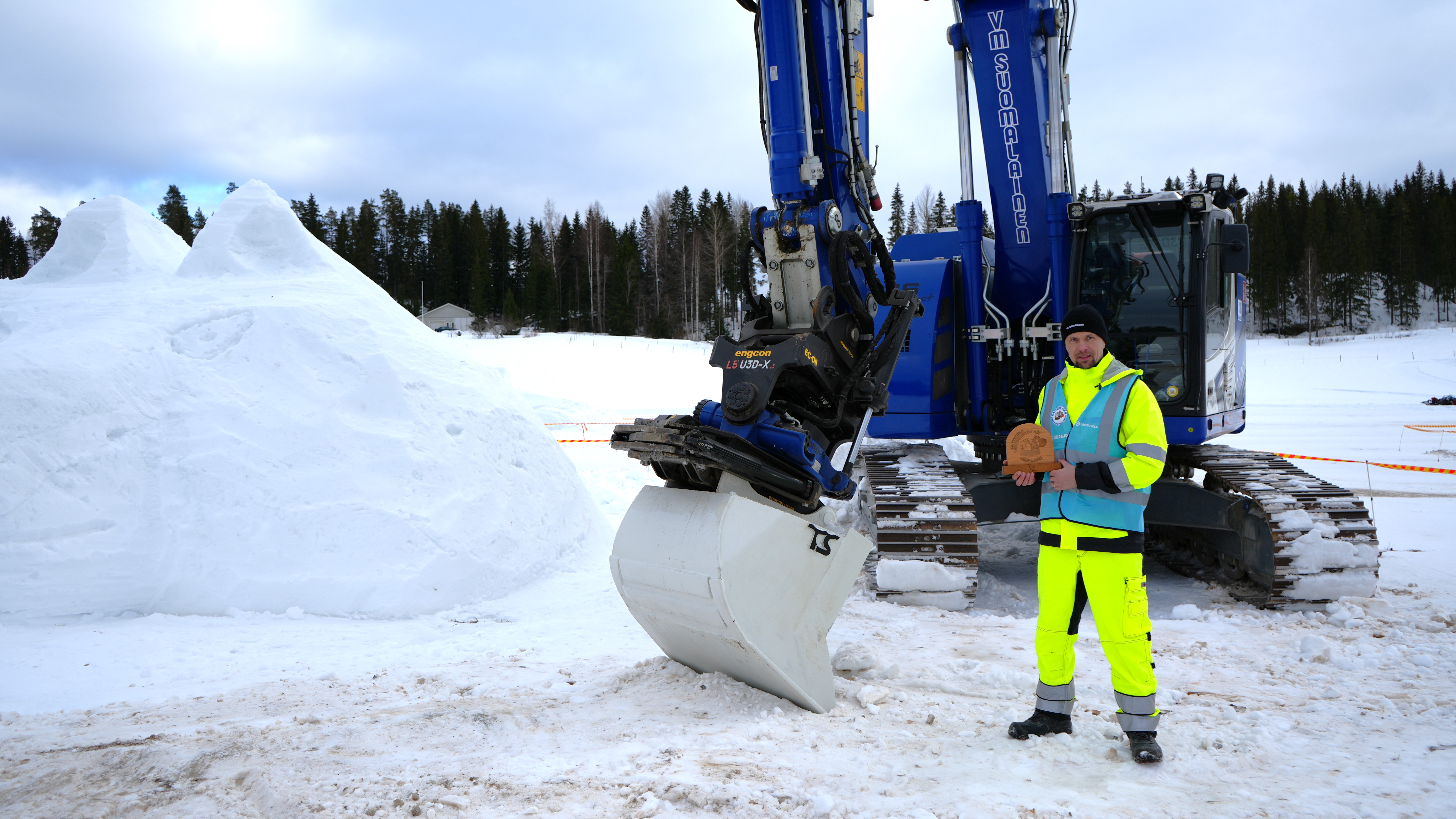 The Liebherr 936 Compact featured in this video is yet another new one for Risto, replacing the one he had at the snow sculpture competition, and he puts the machine though its paces showcasing the versatility of the Engcon tiltrotator with gripper, a combination that helps to reduce the need for ground crews, making everything a lot safer and smoother running on sites.