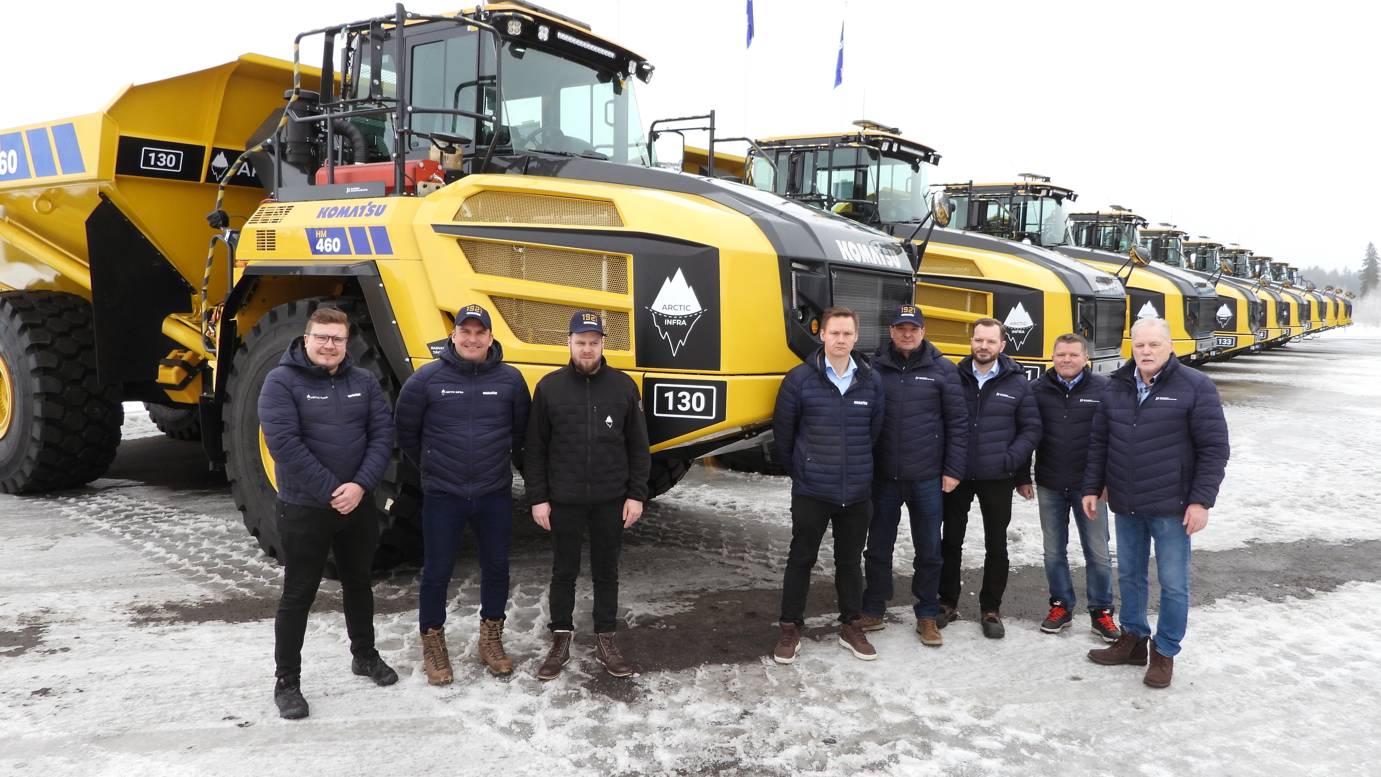 Pictured above from left: CEO Petri Alatalo of Arctic Infra Oy, chairman of the board Jussi Tuohino and maintenance manager Matias Ylisaukko-o are ready to employ 12 new Komatsu HM460-6 dumpers for mines and other infra worksites of the company in Northern Finland. Juuso Ahola, the product manager of Komatsu Europe, and the product manager of Finnish Construction Machinery Tero Ala-Tala, after-marketing manager Jarno Oikarinen, user trainer Timo Siironen and the key customer director Jari Salomäki, who closed the deals on behalf of SRO, are also happily standing in front of the new fleet of machines.