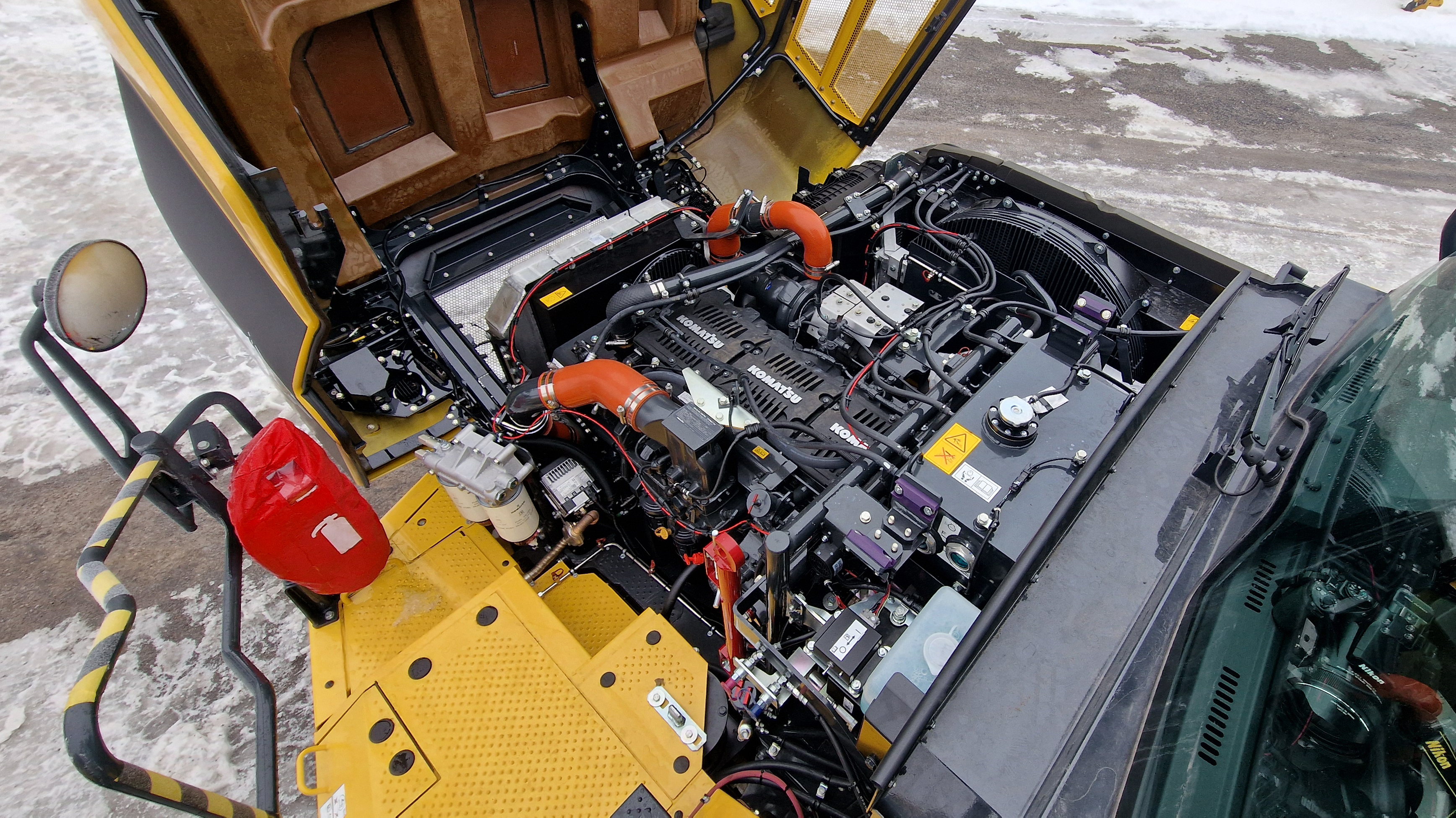 The output of Komatsu’s Stage V engine has increased by nine percent to 386 kW, raising payload capacity to 42 tons. Exhaust gas recirculation has been eliminated, and the variable geometry turbo has been replaced with twin conventional turbochargers. Emissions are controlled with a particulate filter and AdBlue injection system. According to Komatsu, fuel consumption has decreased with the new engine.