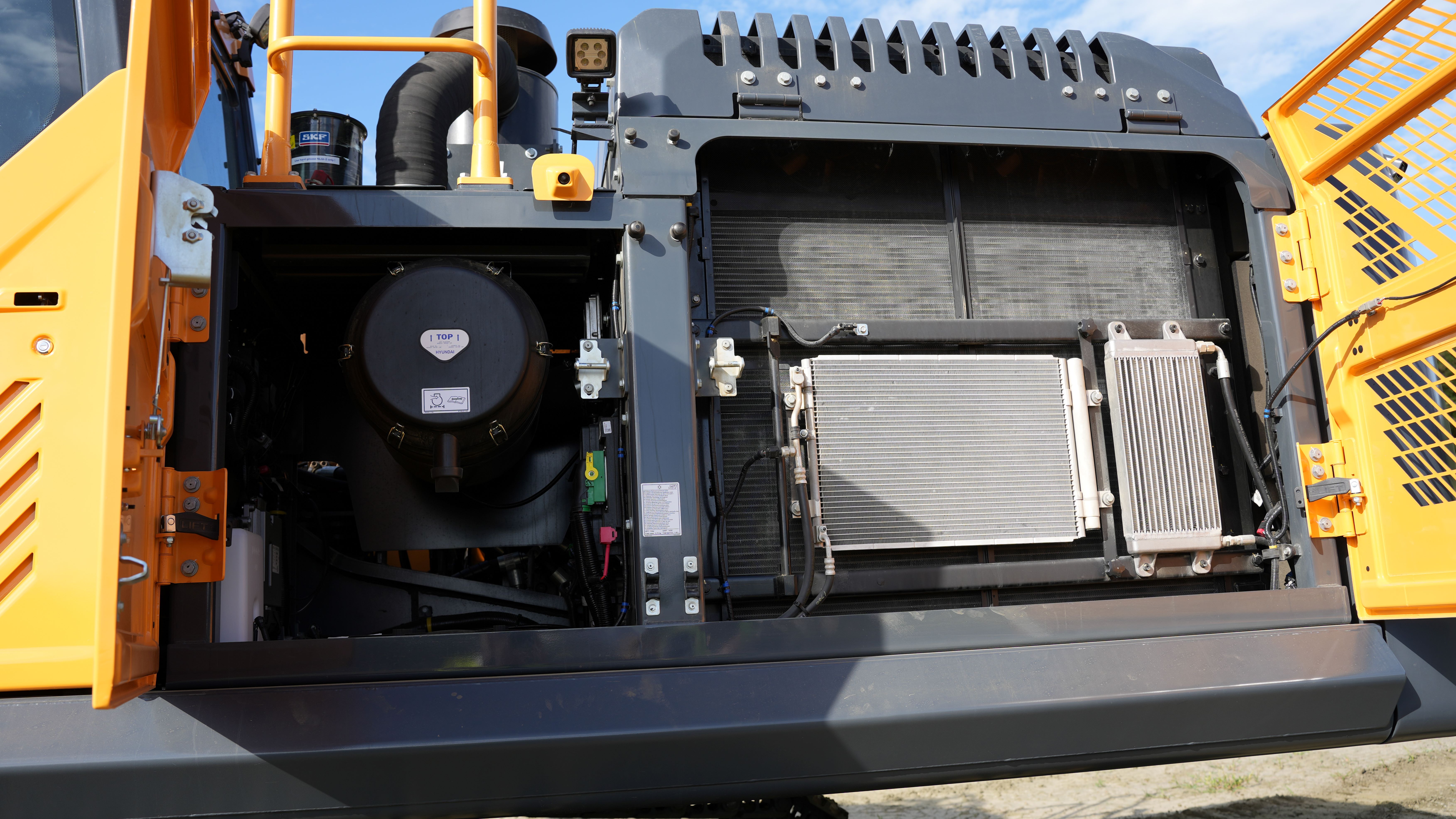 Coming back down to ground level and wandering around to the near side rear, we notice that some things remain the same as ever. Opening up the wide twin rear panel doors, reveals the usual fare, with the cooling packs and air conditioning radiator all easily accessible for cleaning of debris. In addition, the machine is fitted with a reversible fan which also assists with keeping to cooling packs clean of debris