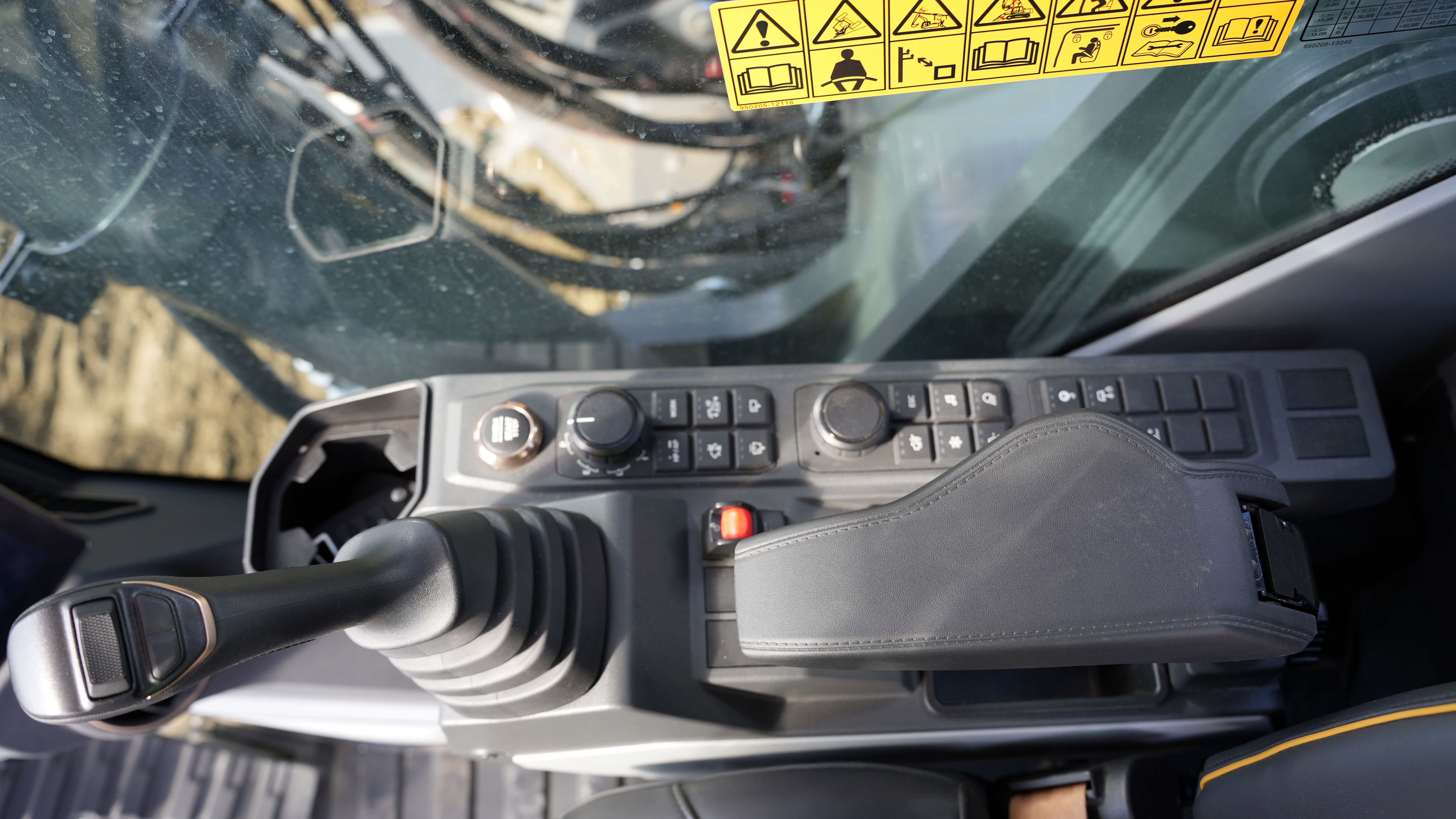 On dark mornings operators will be delighted to see the welcome light strip which is incorporated into front console, lighting up the floor area and further improving safe access to the seat. Talking of the floor area, a newly designed mat is fitted which looks like it will be easier to sweep out at the end of a shift.