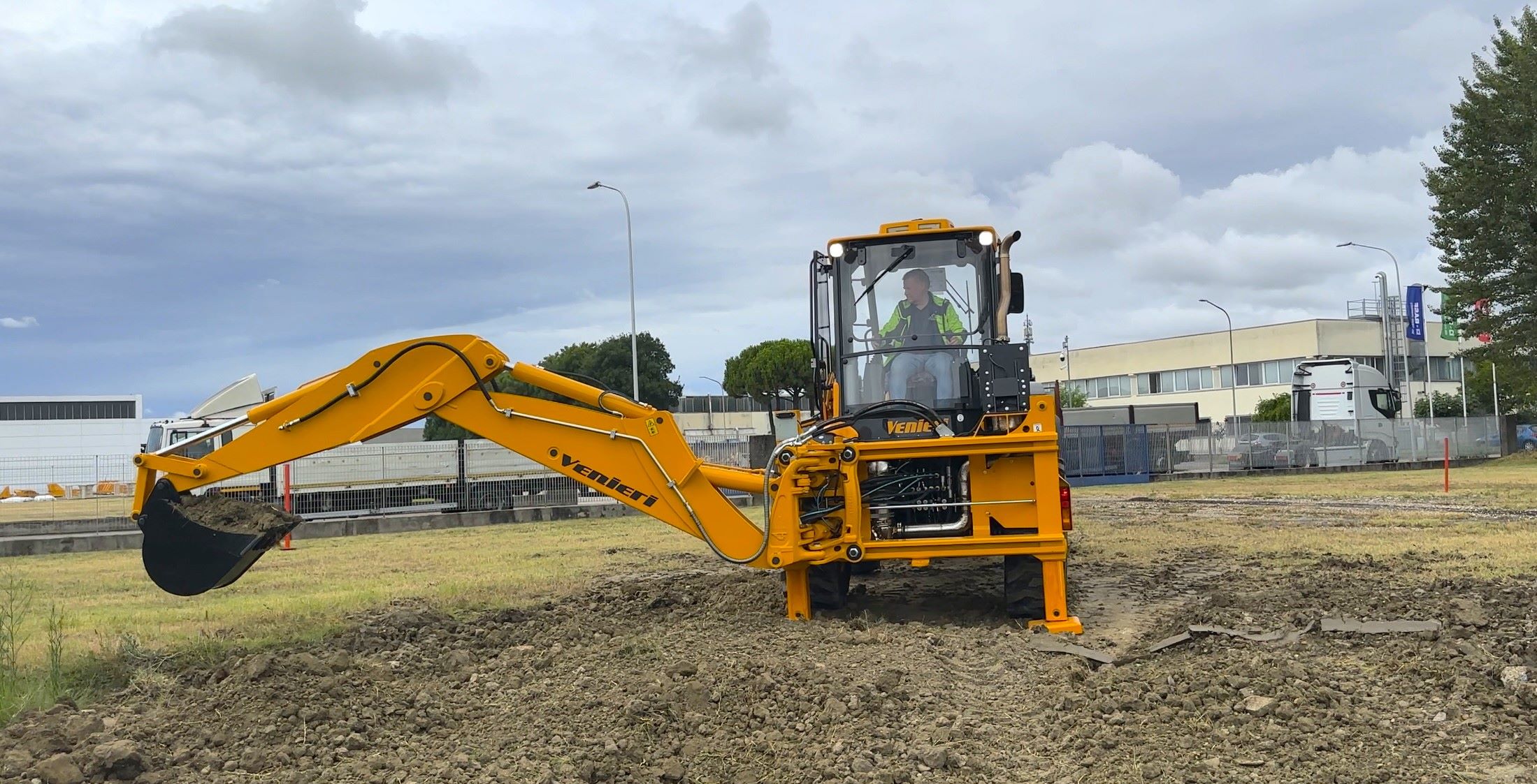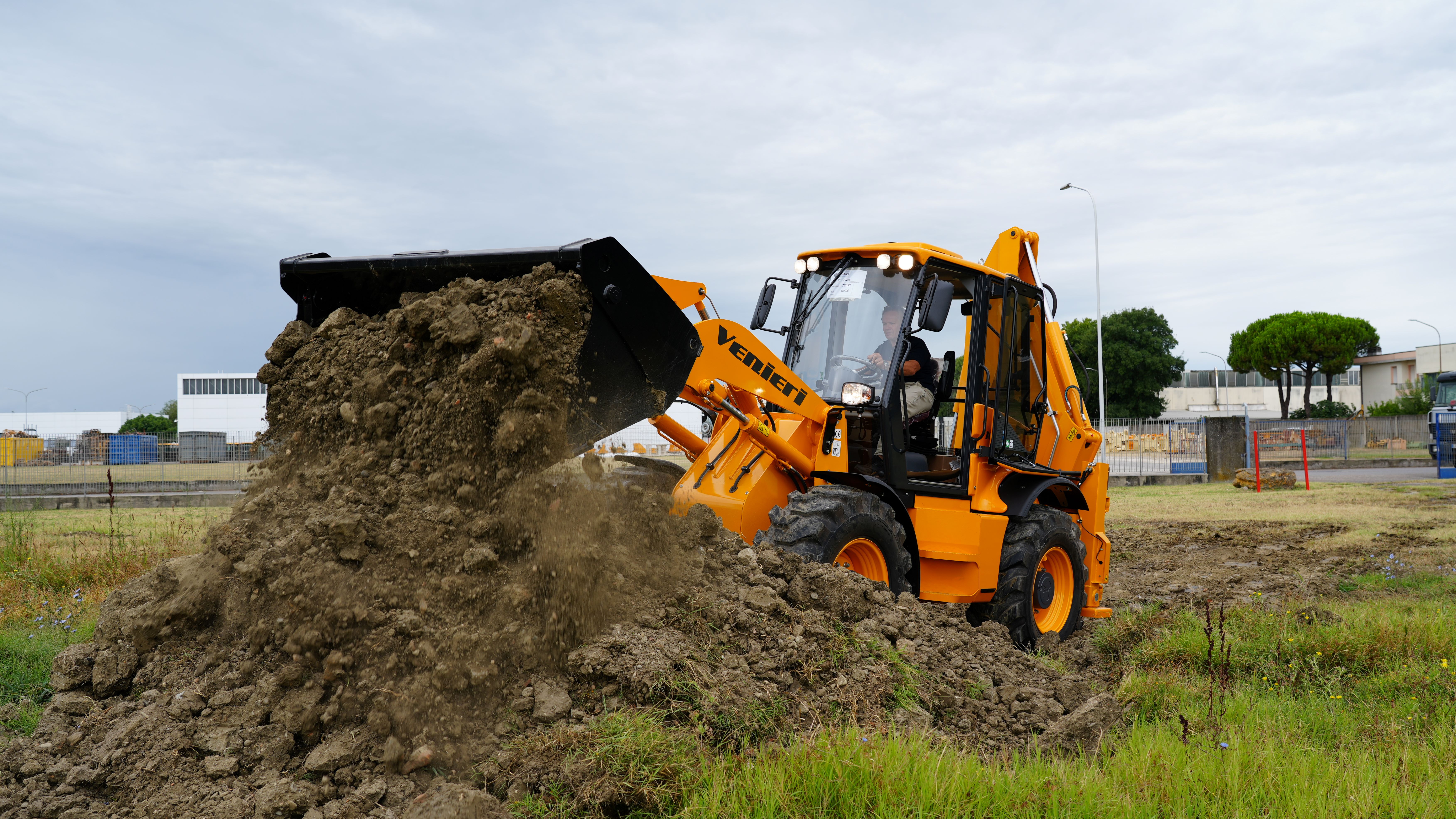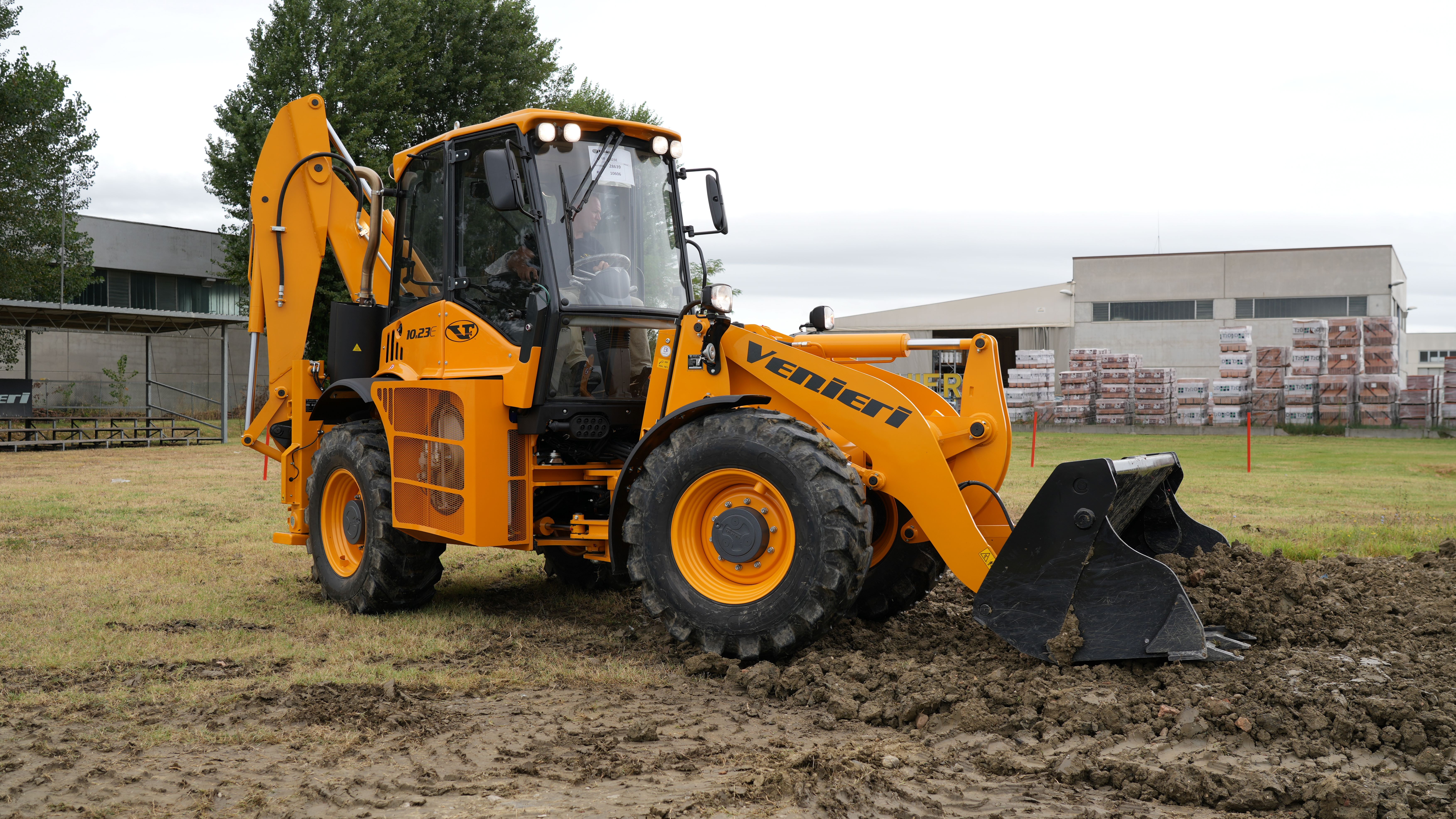Unlike traditional rigid backhoe loader models, the Venieri has its engine centrally mounted in a transverse position, which effectively means no need for an engine housing bonnet at the front, offering improved weight distribution over the axles, increased stability, and improved forward visibility.