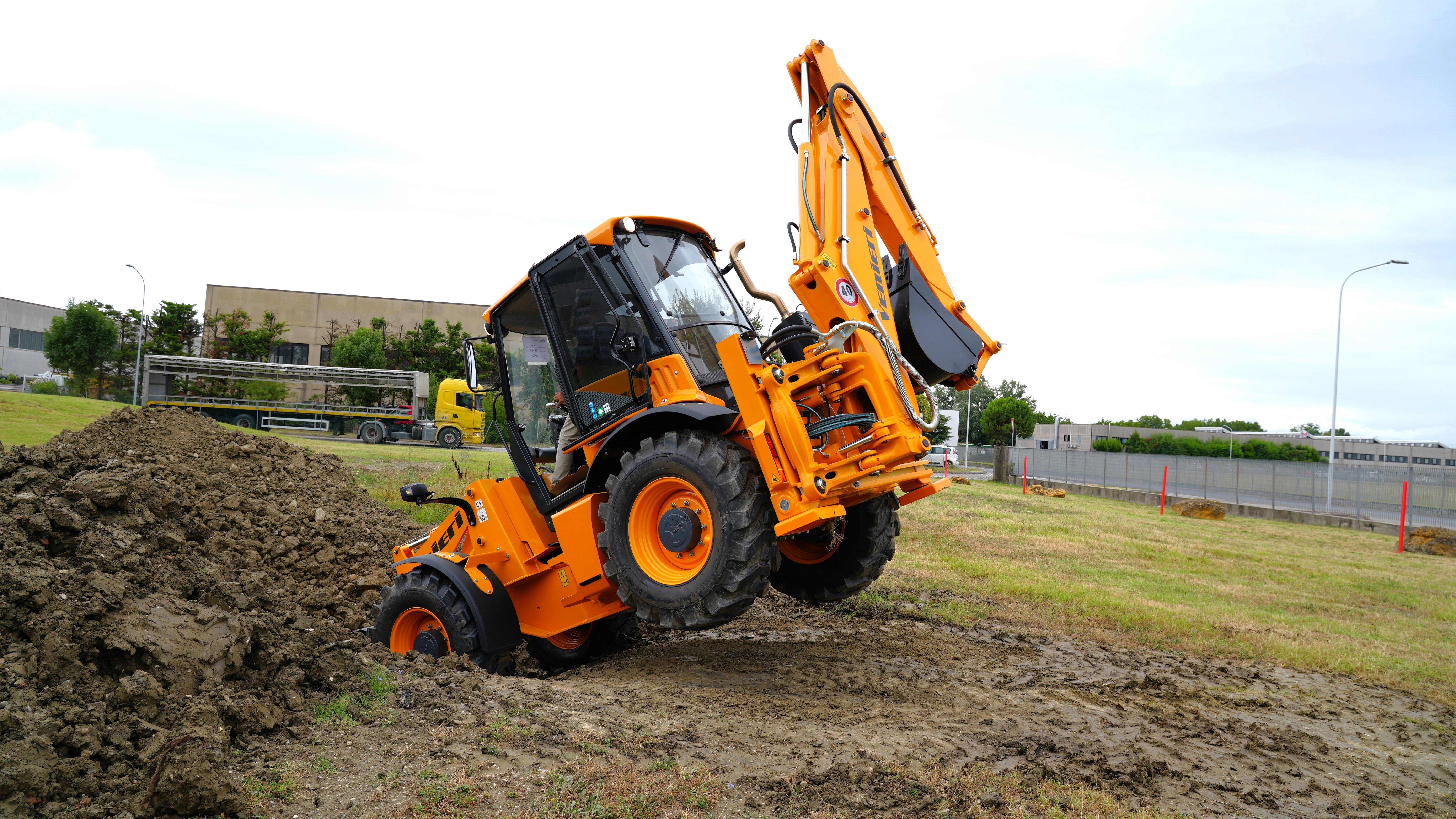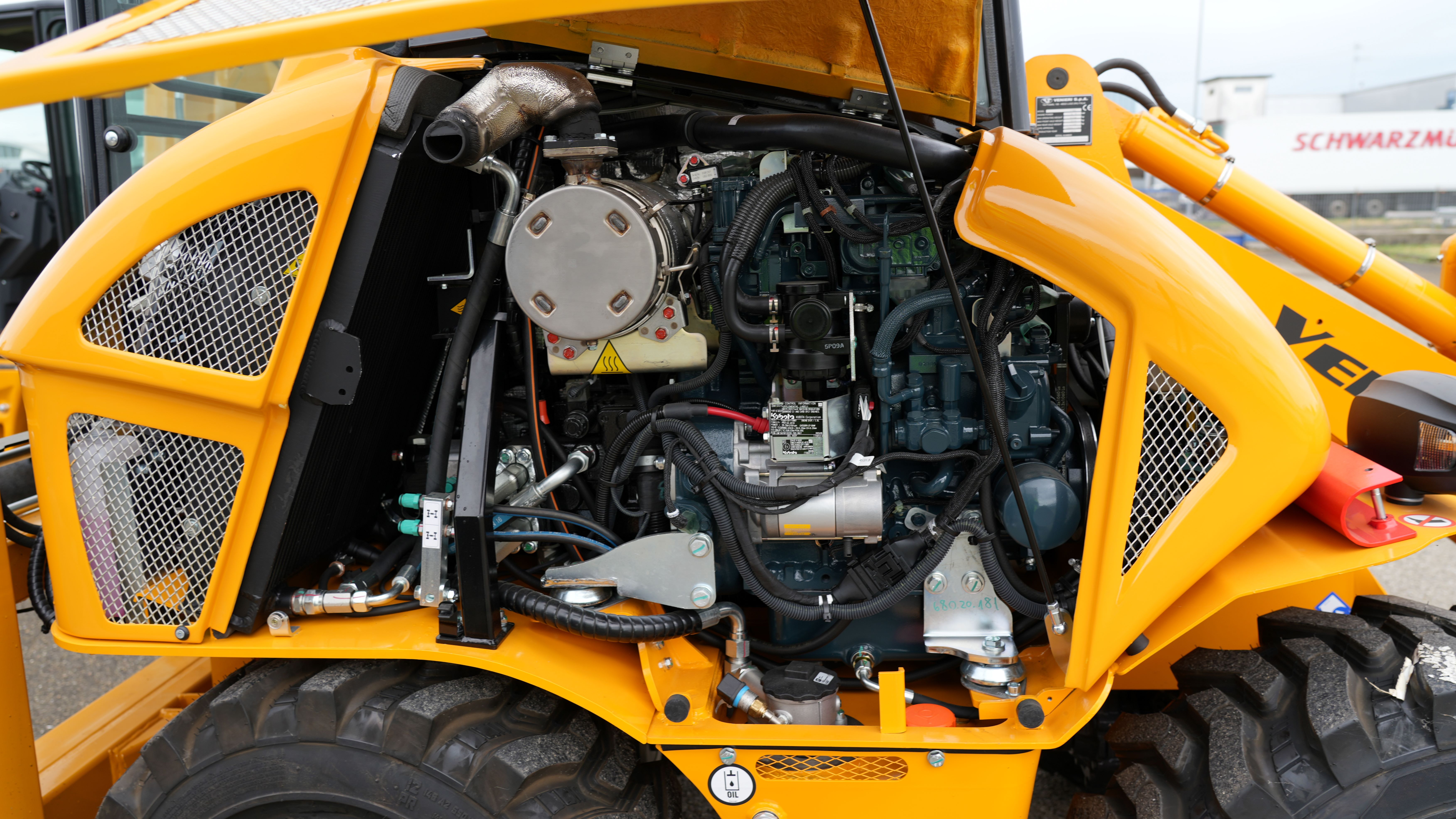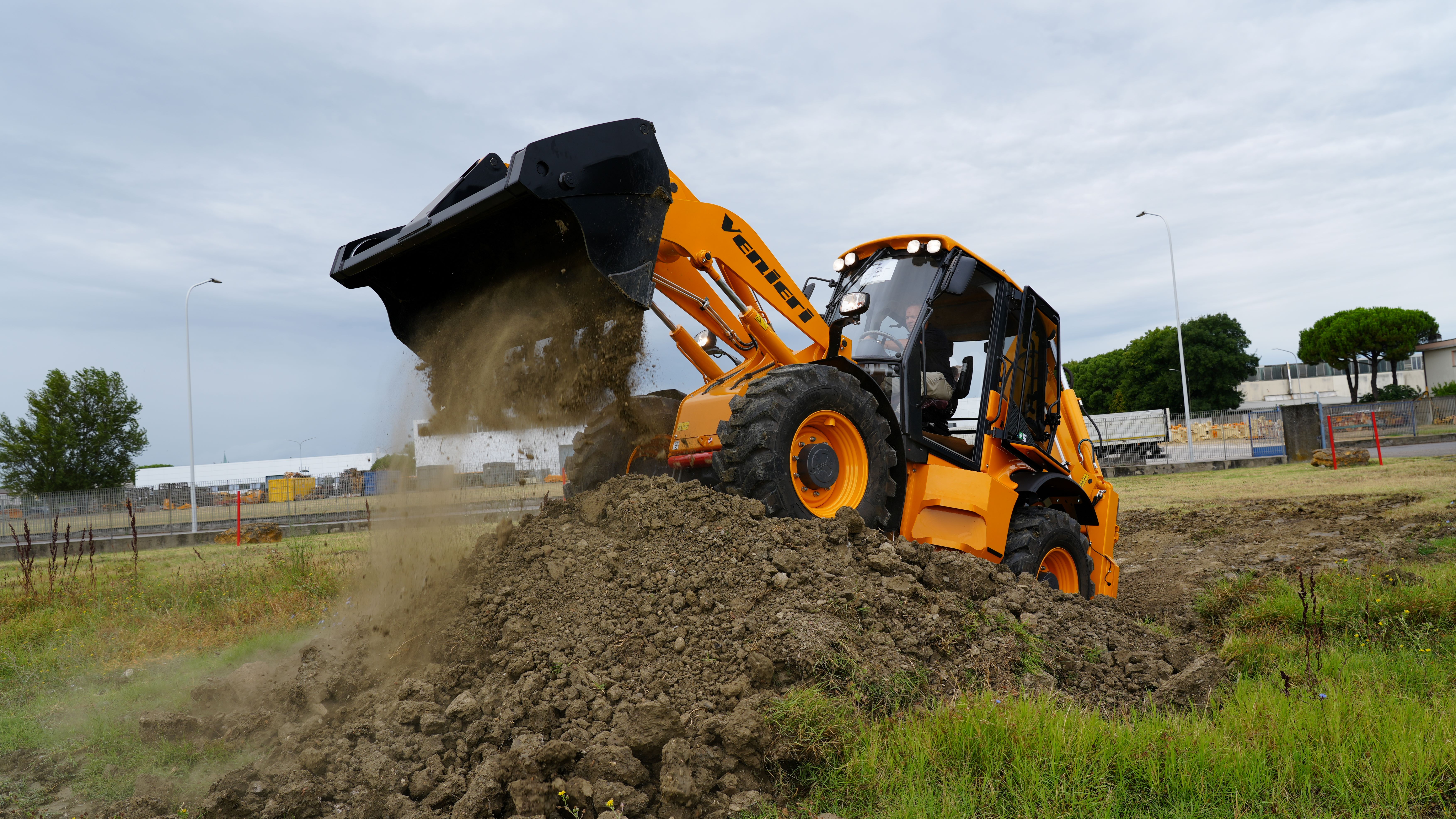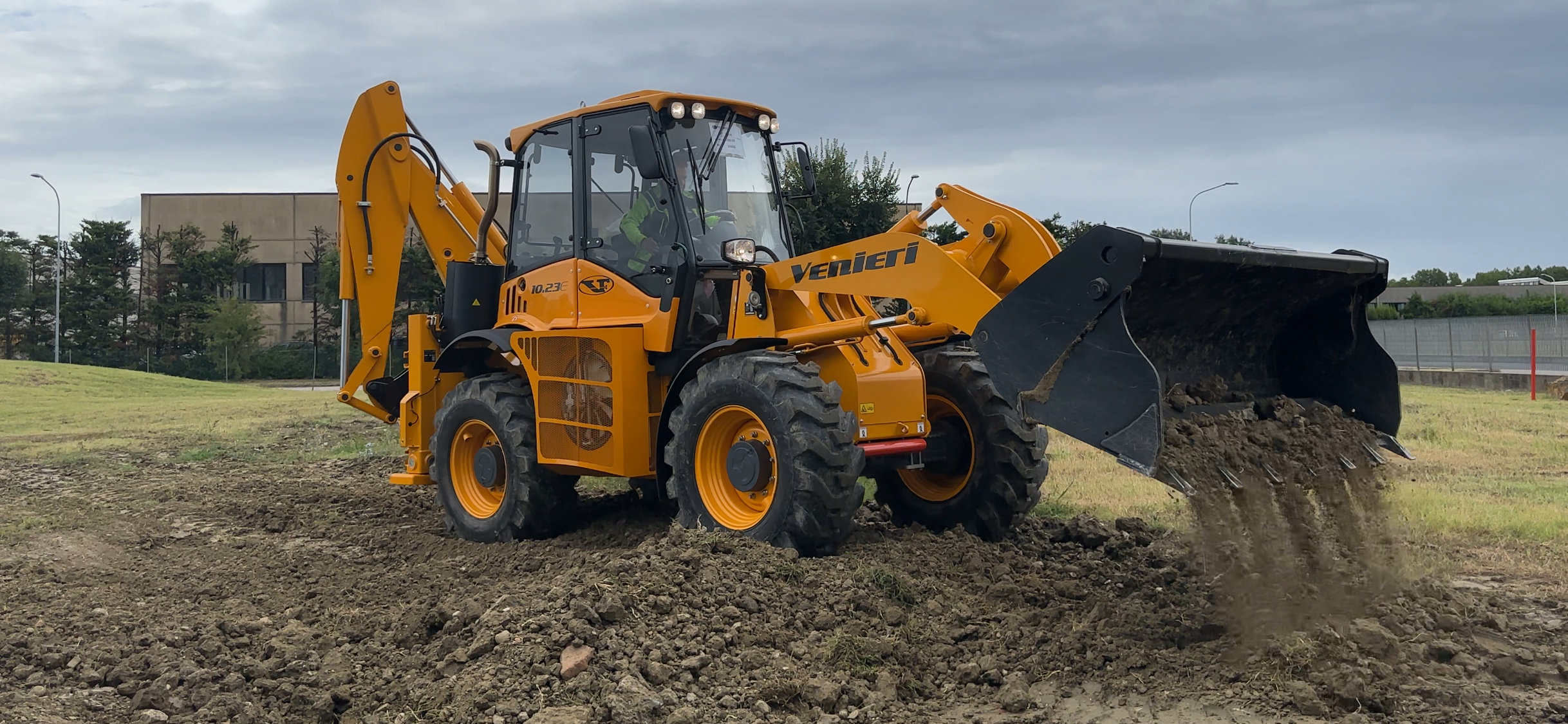Unlike traditional rigid backhoe loader models, the Venieri has its engine centrally mounted in a transverse position, which effectively means no need for an engine housing bonnet at the front, offering improved weight distribution over the axles, increased stability, and improved forward visibility.